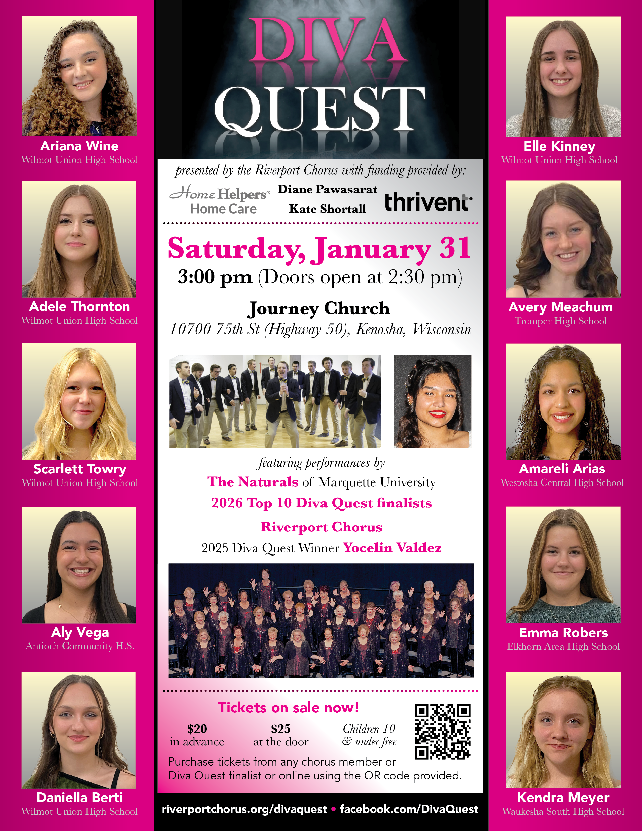 Diva Quest is a non-profit vocal scholarship competition in Southeast Wisconsin. Diva Quest provides young women in high school the opportunity to showcase their vocal singing talents and earn scholarship money towards their post high school education. In preparation for the show, each Diva receives weekly coaching on her solo and learns two songs written in the barbershop style to perform with Riverport Chorus. At the show a panel of four judges and the audience from Illinois and Wisconsin votes on the individuals. Self-esteem and mental health are high priority needs of young females between the ages of 14 and 19 years. Diva Quest supports young females with high quality music education and a structured environment to showcase musical performance.