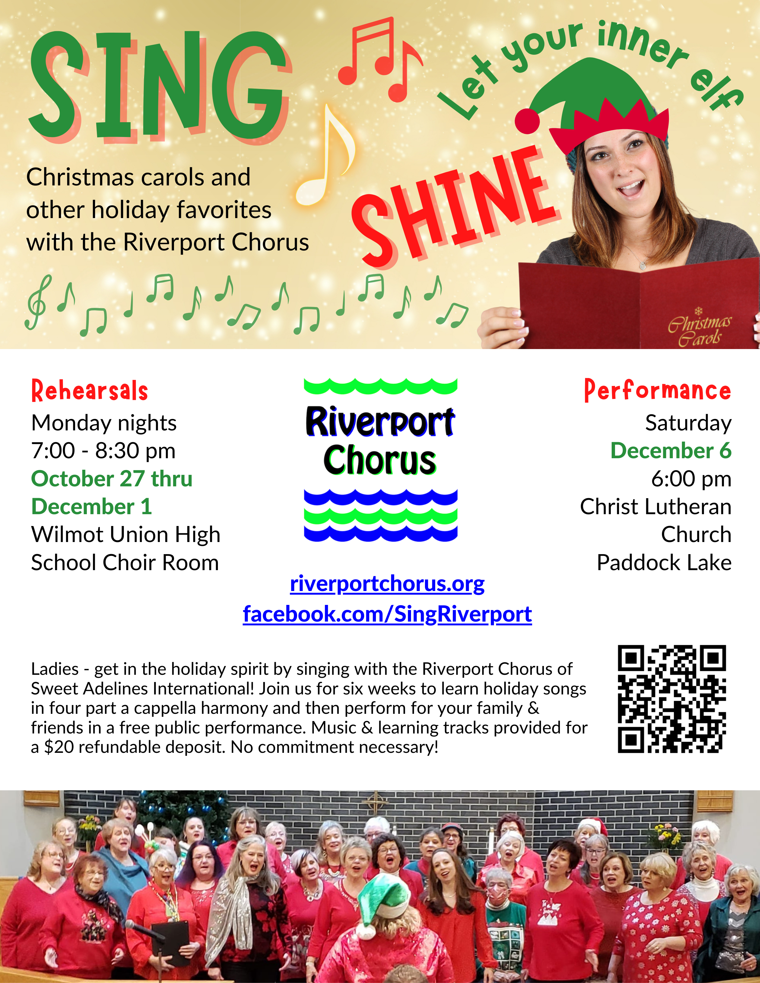 We rehearse every Monday evening at 7 pm, at Wilmot Union High School, 11112 308th Ave, Entrance A, Wilmot, WI 53192. Our rehearsals during inclement weather are currently done via Zoom - contact us for details on how to log in and join the fun.
